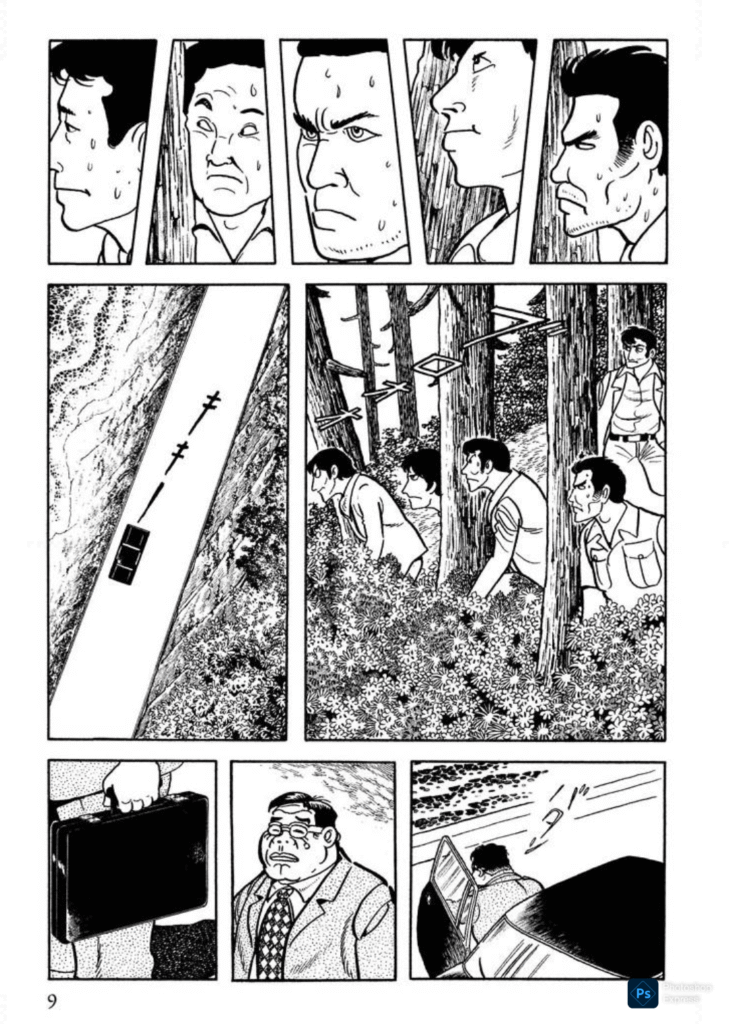 扉頁を開けると、断崖絶壁に、打ち寄せる荒波が描かれています。雄大な自然描写は、火の鳥などでも多用されています。その次のページがこれです。緊張したおっさんたちと、大事そうなアタッシュケースを持つスーツ姿のおっさん。もともと、医学生として学校をサボりまくり、実習もキライだった手塚青年は、しかし、実習レポートに添える臓器の写生があまりにも上手くて成績がよかったことが、漫画家を目指すキッカケになったとの逸話もあるようです(高校時代の友人からの伝聞)。その画力は逸話どおりに素晴らしく、現実にいそうな男性らが、個性を際立たせるデフォルメが加えて描かれています。