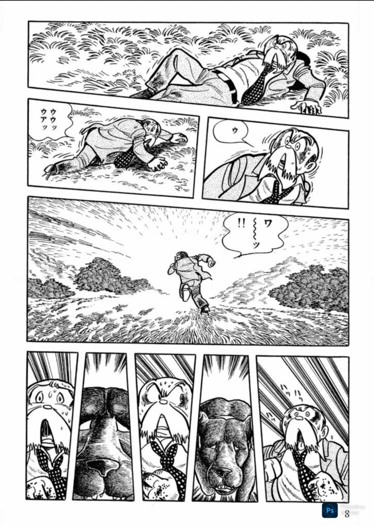 (ところで、アシスタントさんにモブキャラを描かせる漫画家さんも結構いますが、手塚さんはほぼご自身で描いてらしたと聞いたような気がします。アシスタントさんが描く場合も、表情など細かく指定して、ペン入れはご自分でなさっていたんだったと思います。違ってたらごめんなさい。上のおっさんたちも、手塚さんの絵だと、私は感じてるのですが。)
